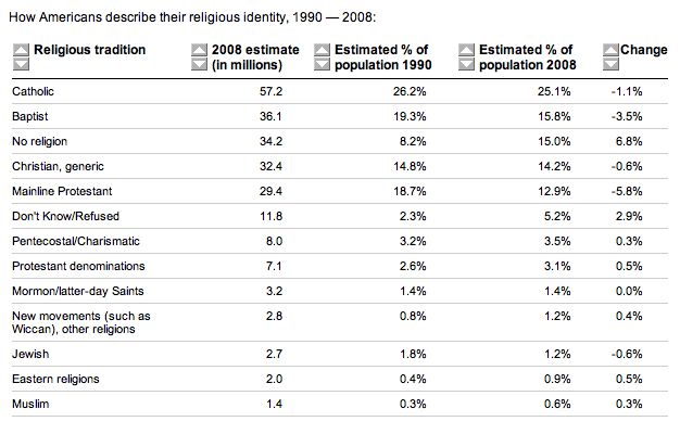 Well, back to the positive: this table shows how various belief systems have fared, popularity-wise, from 1990-2008. "No religion" had by far the greatest percentage growth — from 8.2% to 15.0% of the population.