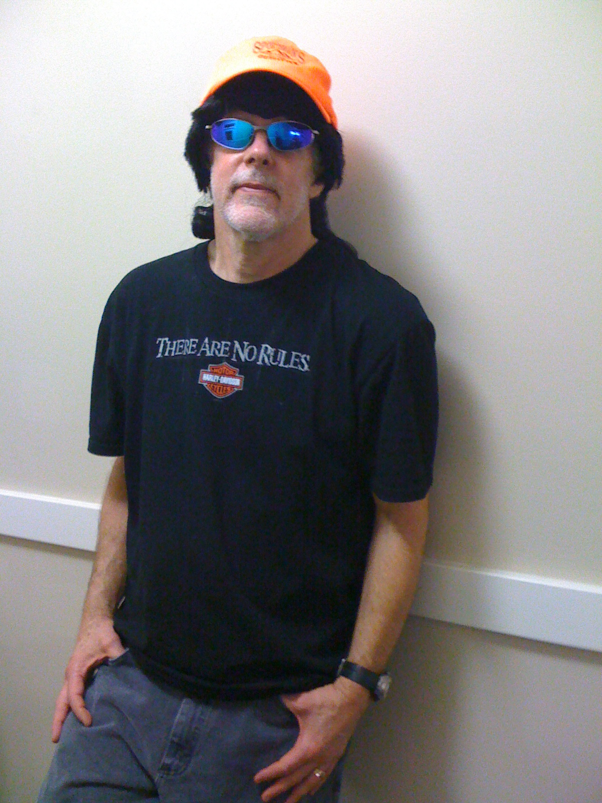 I then accessorized with the very t-shirt that I'd been wearing normally all day, my dearly beloved Harley-Davidson "there are no rules" shirt. I capped it off with a Sportsman's Outfitter hunting cap and some blue shades to match Laurel.