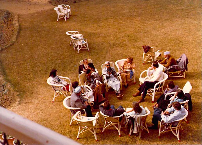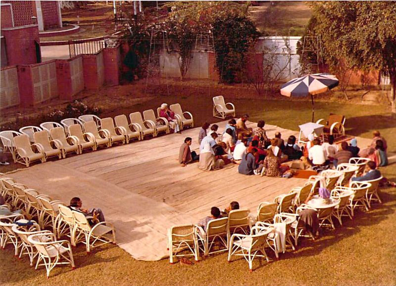 This 1977 photo was taken in India at the headquarters ("Dera") of the spiritual group, Radha Soami Satsang Beas, that I belonged to for over thirty years. I'm the guy in a white shirt with my chin on my hand — at the one o'clock position in the circle.