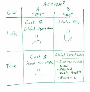 Substitute "a religious belief" or "belief in God" for "dangerous global warming" and the decision grid works just the same. This is what Pascal tried to do in his famous wager.
