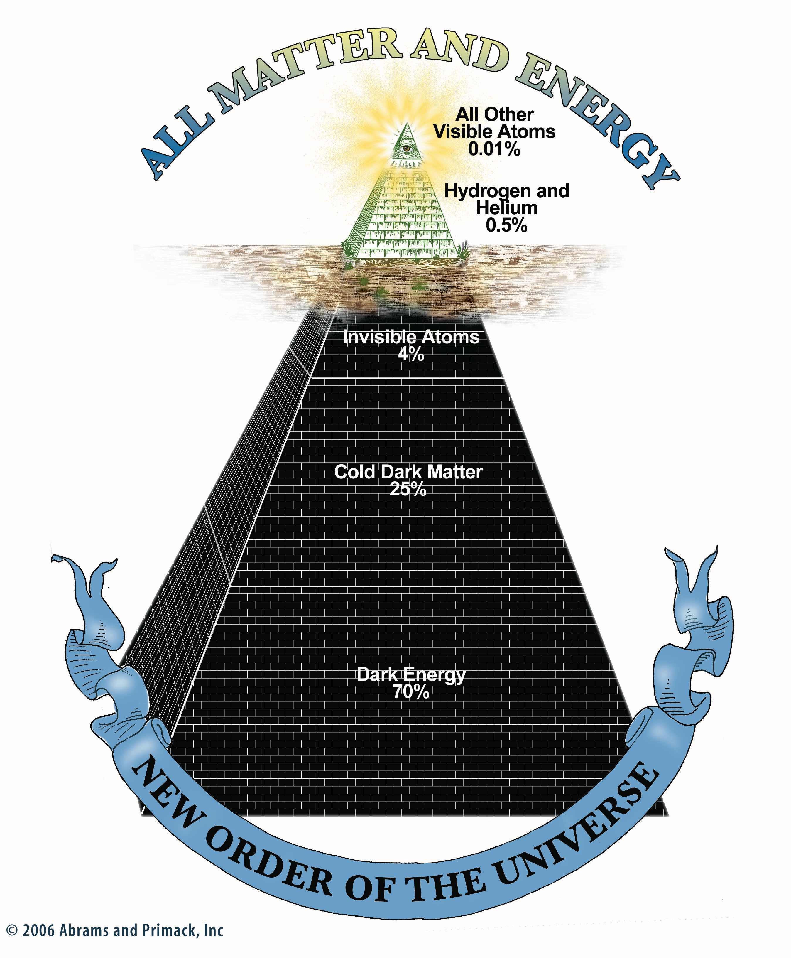 Visible matter is only 0.5% of the total. The black part of the pyramid represents the invisible: that is, what we do not see but know is there. The top and smallest layer of invisibility is simply non-shining and unlit atomic matter — matter that is invisible in fact, but not in principle. It is about 4 percent of the total.