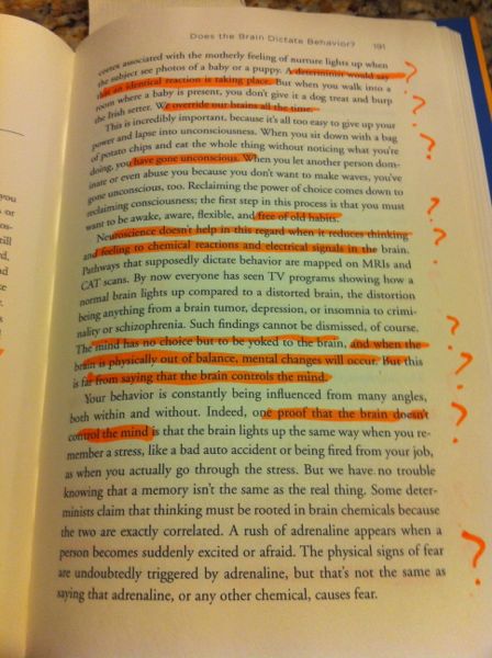 Those are nine — count them, nine — marginal question marks that I highlighted in on a single page of Chopra's attempt to convince readers that the human mind is the non-physical hidden controller of the physical brain.