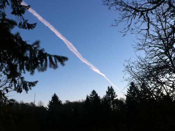 But, just in time, I noticed another vapor trail. Another jet, headed in the same direction as the first one. Yet now I could see the jet. It was illuminated by the setting sun.