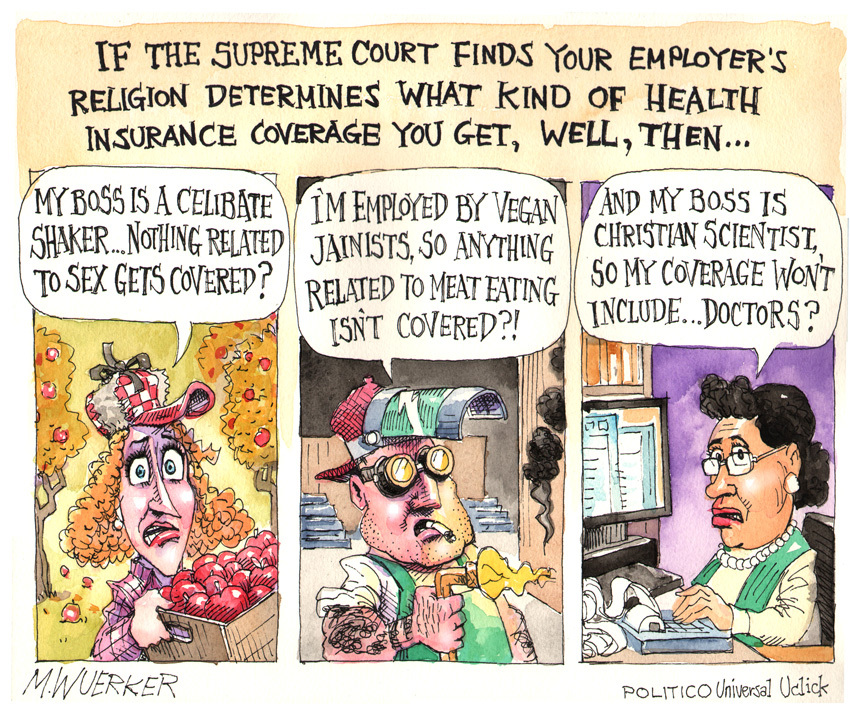 This great Matt Wuerker cartoon shows how crazy it would be if someone's personal beliefs were able to determine what sort of health insurance coverage his or her employees could get.