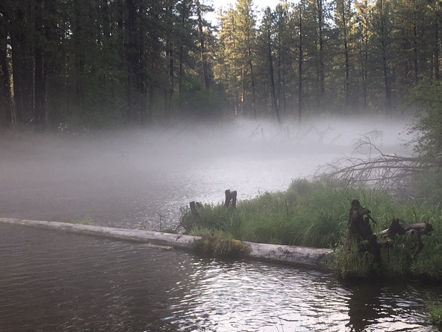 After a cloudless 94 degree day suddenly turned into a 62 degree afternoon thunderstorm with heavy rain and hail, some sort of rare weather happenstance created fog on the cold spring-fed waters of the upper Metolius — where family dog and I set out on our usual walk.