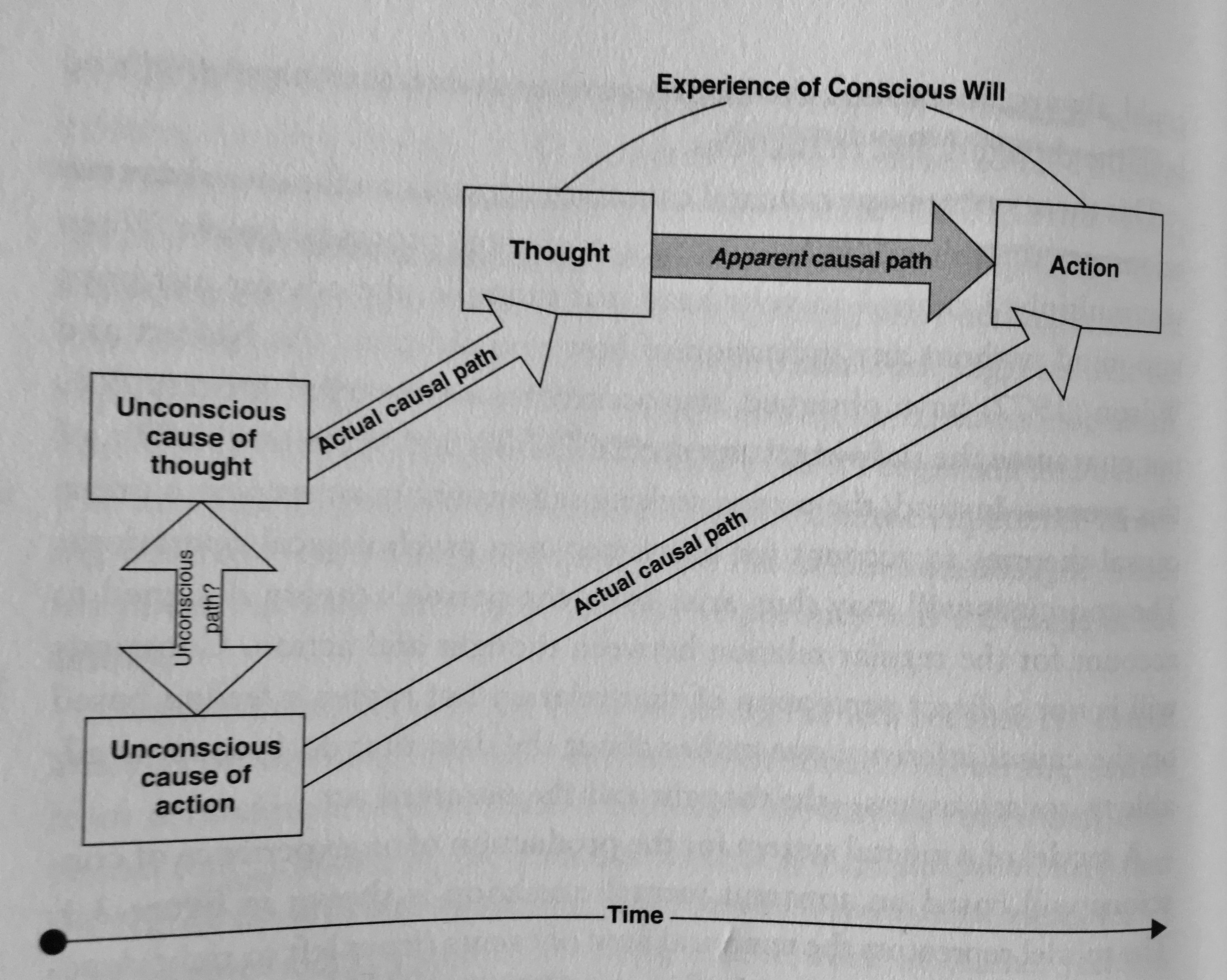 Well, study carefully this photo I took of a fascinating figure in Daniel Wegner's book, "The Illusion of Conscious Will," and you'll get a very interesting explanation of why the experience of conscious will is indeed an illusion.