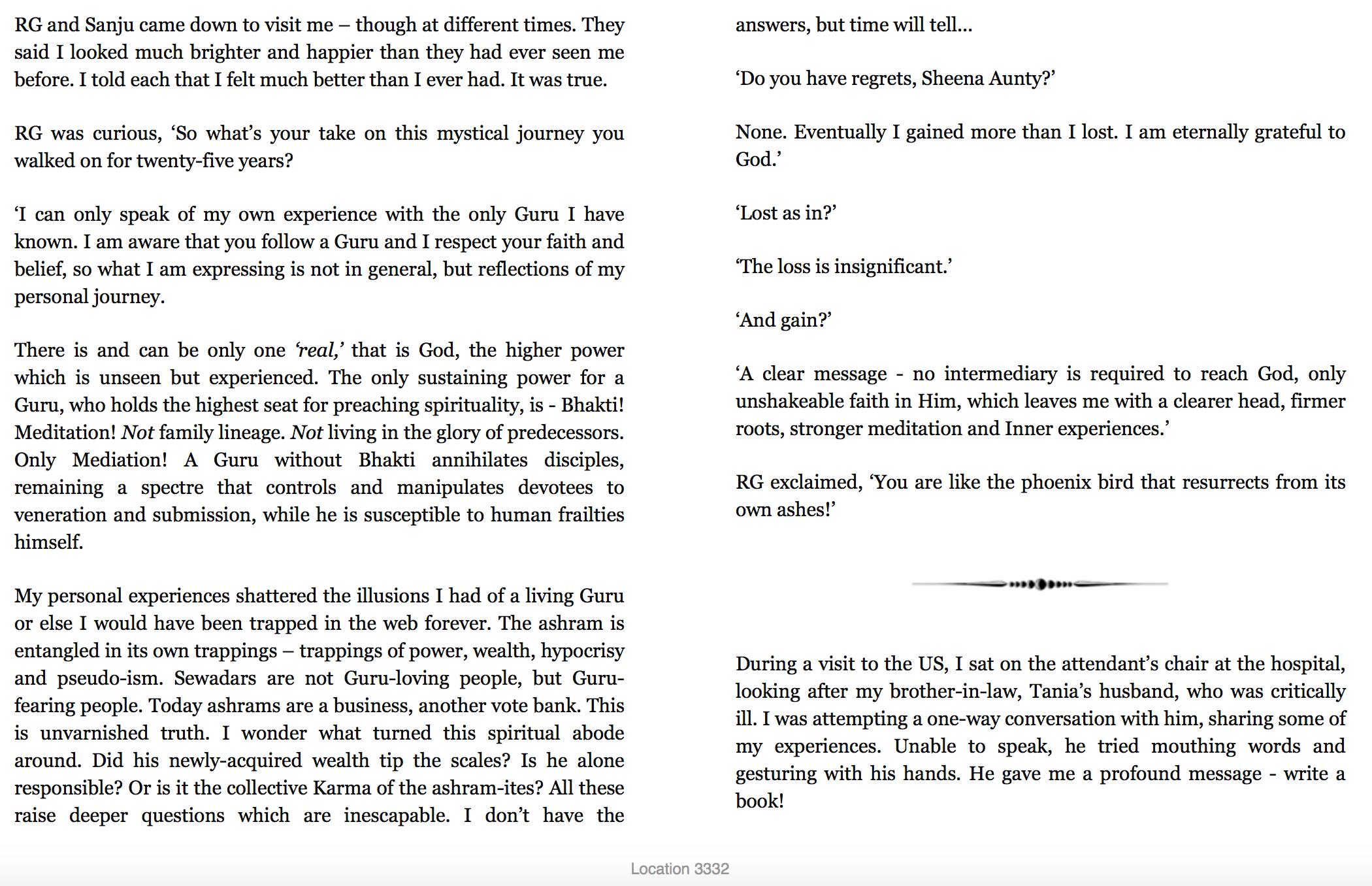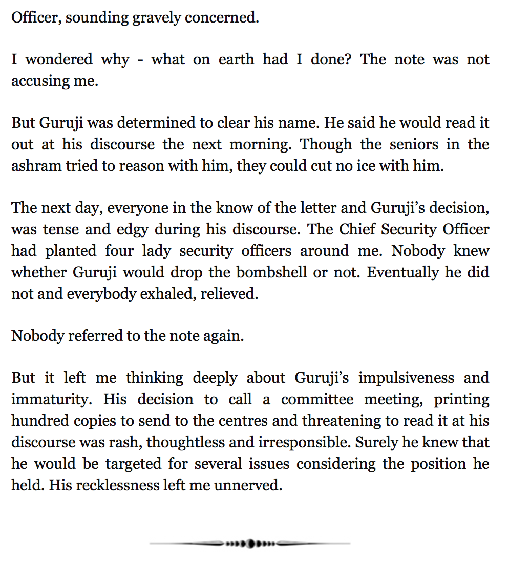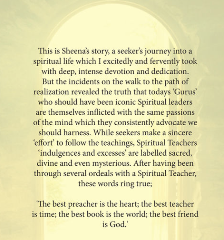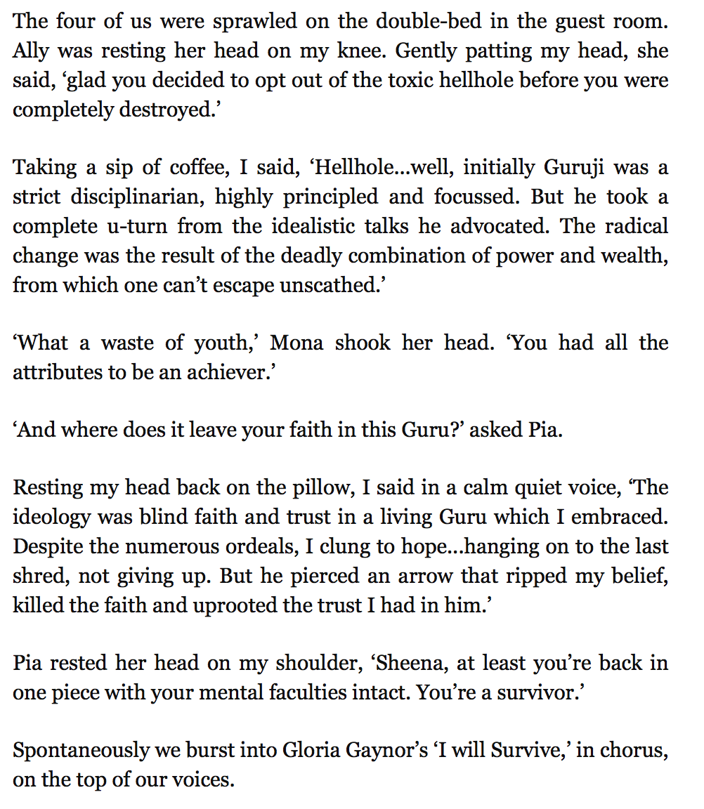 What follows are some additional screenshots of portions of the book relating to her time as a Gurinder Singh devotee, and a sewadar (volunteer) at the Dera. I'm sharing these excerpts because I want to stimulate people to buy Sheena's book, and I'm pretty confident that she wants her story as widely known as possible.