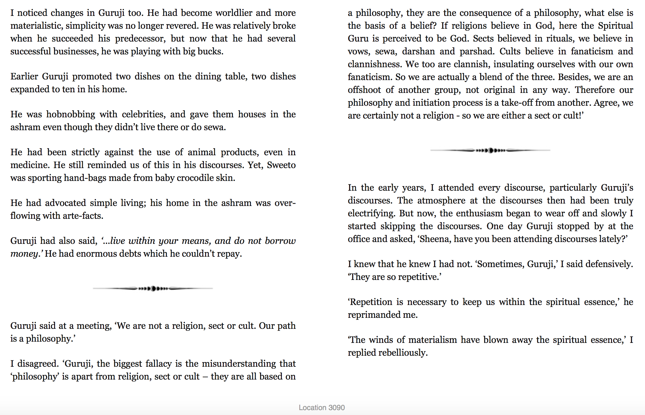 I've just looked through the parts describing Sheena's initial infatuation with Gurinder Singh and the RSSB teachings, which led to a massive disillusionment when, after a lot of personal contact with the guru, she realized that he was just a flawed human being, not a "perfect master."