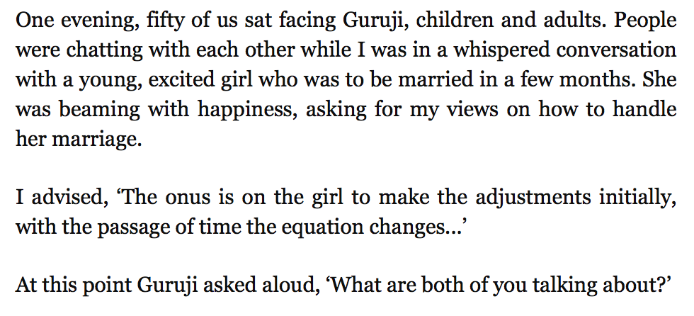 Another brave and truthful observation by Sheena. What went through my mind after reading this passage was, "The guru is a jerk!" Also, sexist and, as Sheena says, a very ordinary human.