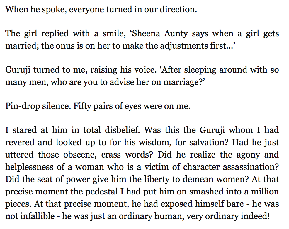 It sounds like India hasn't gotten on board with the Me Too and Times Up movements, or at least the Dera hasn't — because Gurinder Singh's concern was with how he would be viewed, not with how Sheena would be seen, or whether the accusation that the guru "chased" a young female disciple had some truth behind it.