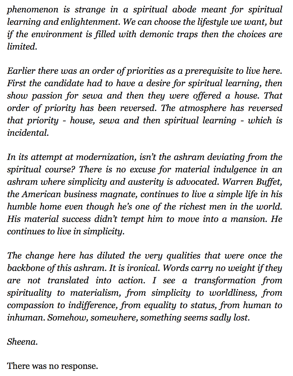 More conjecture from a woman who became disillusioned because she was too lazy to meditate enough in those 25 years of service. How ungrateful she is to the master who only treated her bad to wake her from her slumber of worldliness. She obviously failed the master’s divine test.