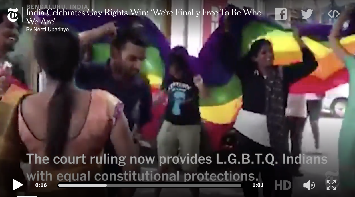 Way to go, India. Your Supreme Court has given gays in India the same rights as anyone else. Here's a screenshot of a video on the New York Times story about this that shows people in India celebrating.