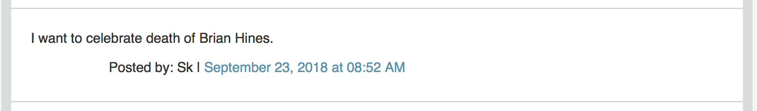 And no doubt, then, you also found this “Sk” character’s disgusting comment about Brian’s death to be a brilliant piece of black humor? And no doubt you find Brian himself a humorless and literal-minded prig, who when he speaks out about this particular comment and about the comments under the “Nasty Comments” post/thread and in that whole “I hate Brian Hines” blog, is only actually expressing his own inability to appreciate the brilliant and witty black humor that all of these people are indulging in?