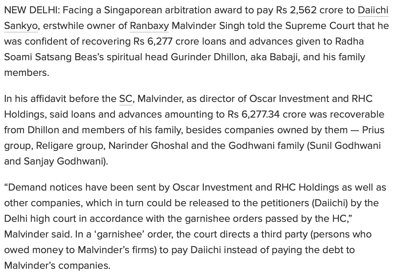 As you can read below in the screenshots I made of the story, the massive amount of loans and advances given to Gurinder Singh Dhillon and his family is preventing payment of the arbitration award to Daiichi Sankyo.