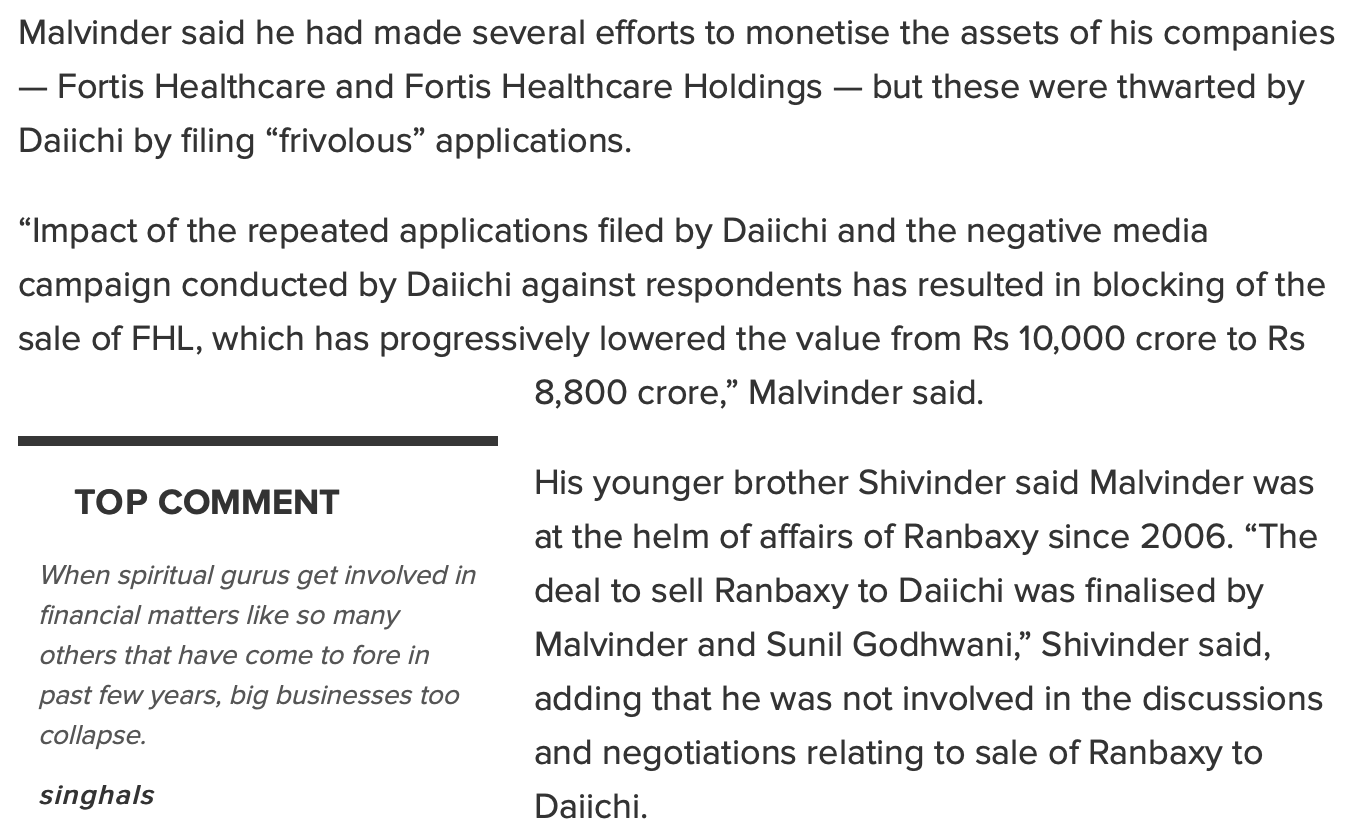 The story provides further evidence that defenders of the guru are wrongly claiming that this is just a family affair. (Malvinder Singh is the guru's cousin; some say nephew, but I've been told cousin is the correct relationship.)