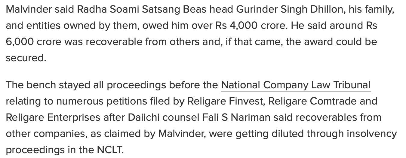 in yesterday's post about there being a contest between Daiichi and Religare for money owed to them by the Singh brothers — which seemingly would include the massive amount of money owed by the RSSB guru. In that post I mentioned various "actors" in this financial scandal drama.