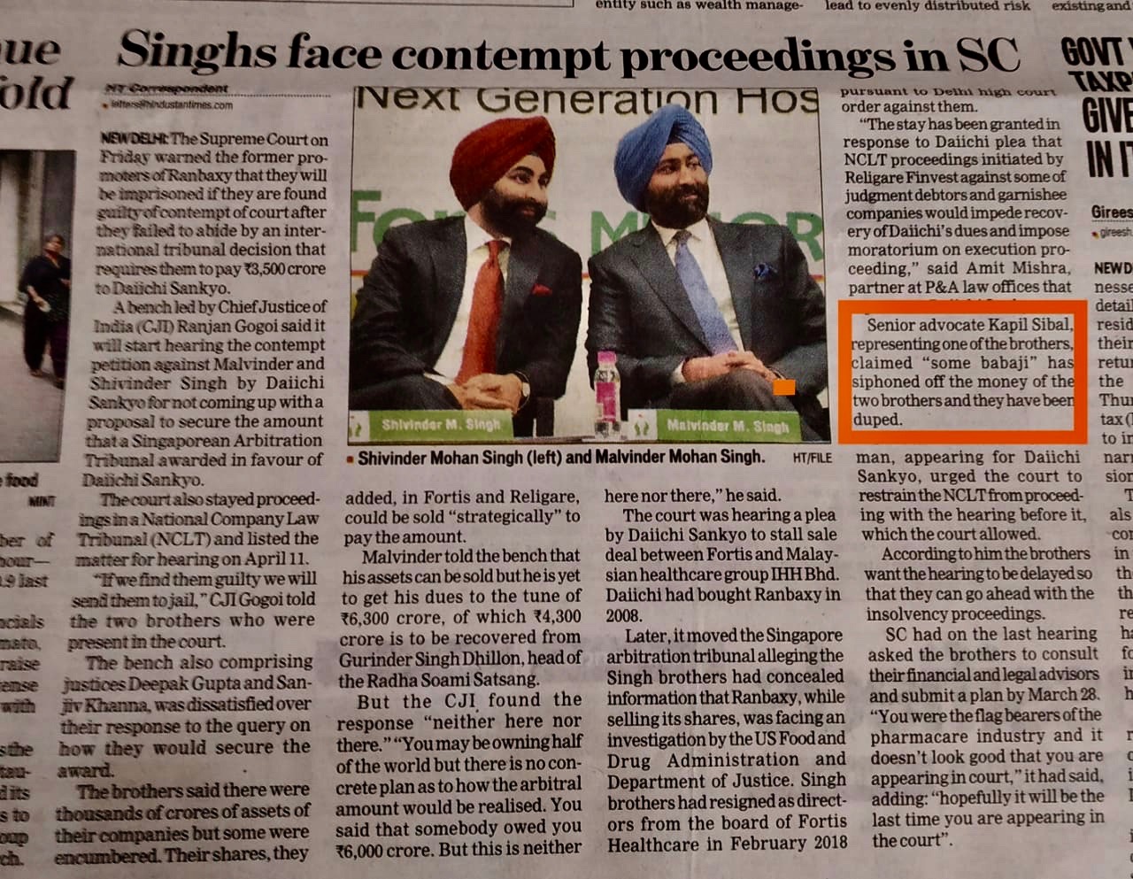 It's dawned on me that the relatives of the Singh brothers and their uncle, Gurinder Singh Dhillon, also have a role here. Likely leaders of the family are shocked that Malvinder and Shivinder could go to jail if Uncle Gurinder doesn't pay back the money he got from them via fraudulent means (allegedly).