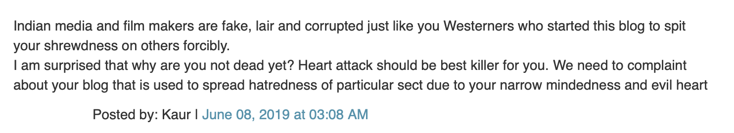 I enjoy getting comments from readers of this blog, even those who want me dead. Can't resist making some observations on what Kaur said.