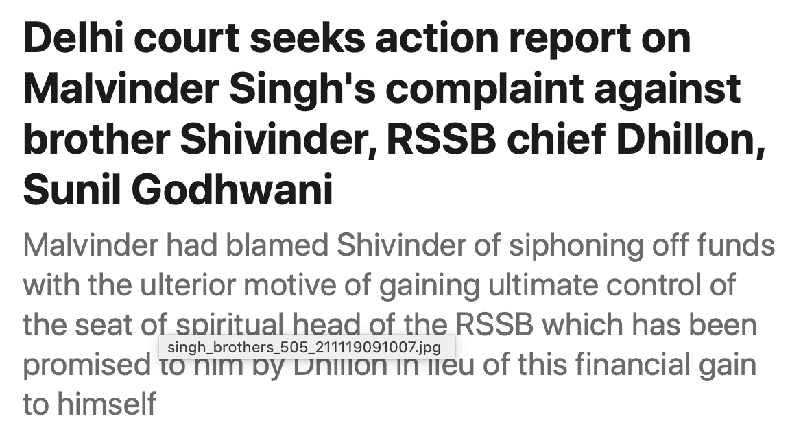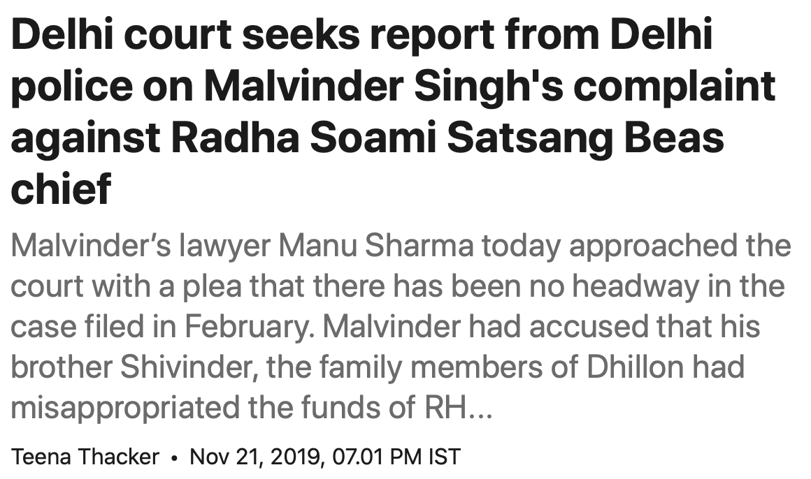Below are two stories in the Indian financial press relating to the criminal complaint filed in February 2019 by Malvinder Singh against his cousin, Gurinder Singh Dhillon, the guru of Radha Soami Satsang Beas. (A Bloomberg story said that an investigation had been opened.)