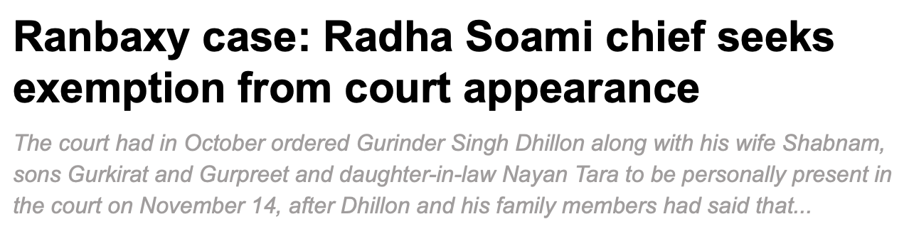 After being ordered by the High Court of Delhi to appear before it on November 14, along with other parties involved in what appears to be fraudulent transfers of funds that now prevent the Singh brothers from having enough money to pay an award related to their sale of a pharmaceutical firm, the family of Gurinder Singh Dhillon, guru of Radha Soami Satsang Beas, has made up some marvelously unbelievable excuses for not being able to make the court hearing.