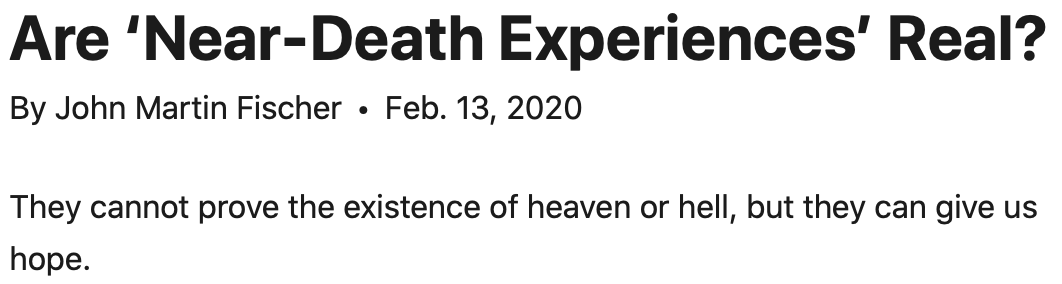 Likewise, John Fischer, the author of this opinion piece who has written several books about near-death experiences, says that while there's no doubt that people have them, there's no solid evidence that they prove the reality of life after death, heaven, and such.