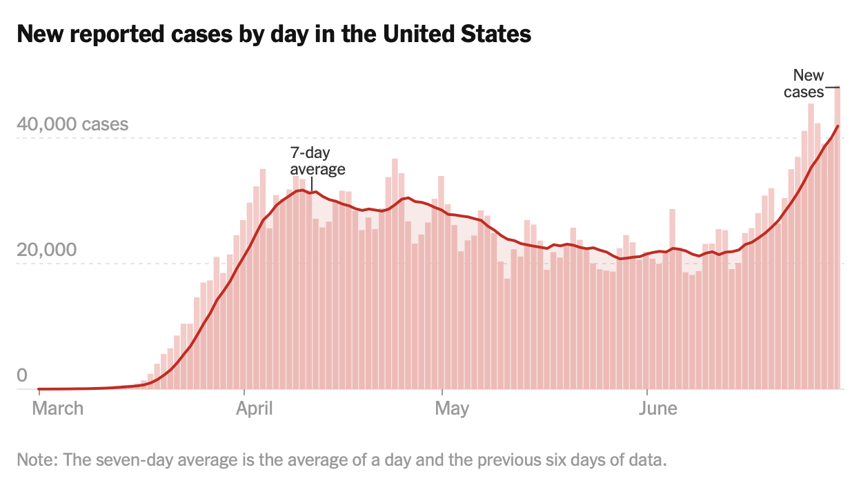 Currently there are more new cases being reported than at the previous height of the pandemic in April. At Trump's urging, states reopened their economies before public health experts said they should. In fact, before White House's own reopening guidelines said they should.