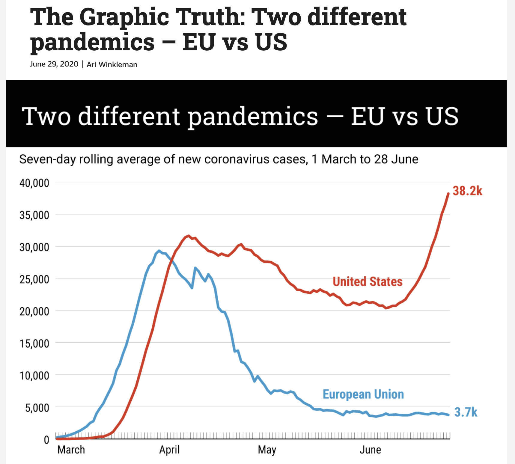 The United States and the European Union have comparable population sizes, but the trajectories of their COVID-19 outbreaks have been vastly different. Data recently released by the European Center for Disease Control and Prevention shows that while there are around 4,000 new COVID cases in the EU each day, the United States is now recording over 40,000 new cases of the virus each day.