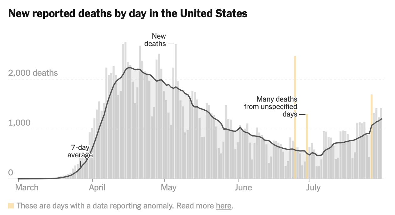So it spreads easily, and the more it spreads, the lower the death rate appears to be, on an exploding denominator of infection. But the deaths are still climbing as the infection still continues to spread.