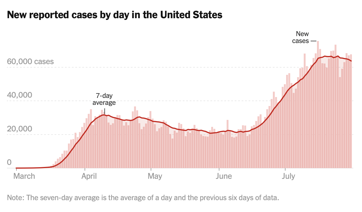 So this country had a moderate decline in COVID cases after a peak in early April. Then people got complacent, figuring they knew more that public health experts, and now we're suffering from a steep unswing in cases. Also, in deaths.