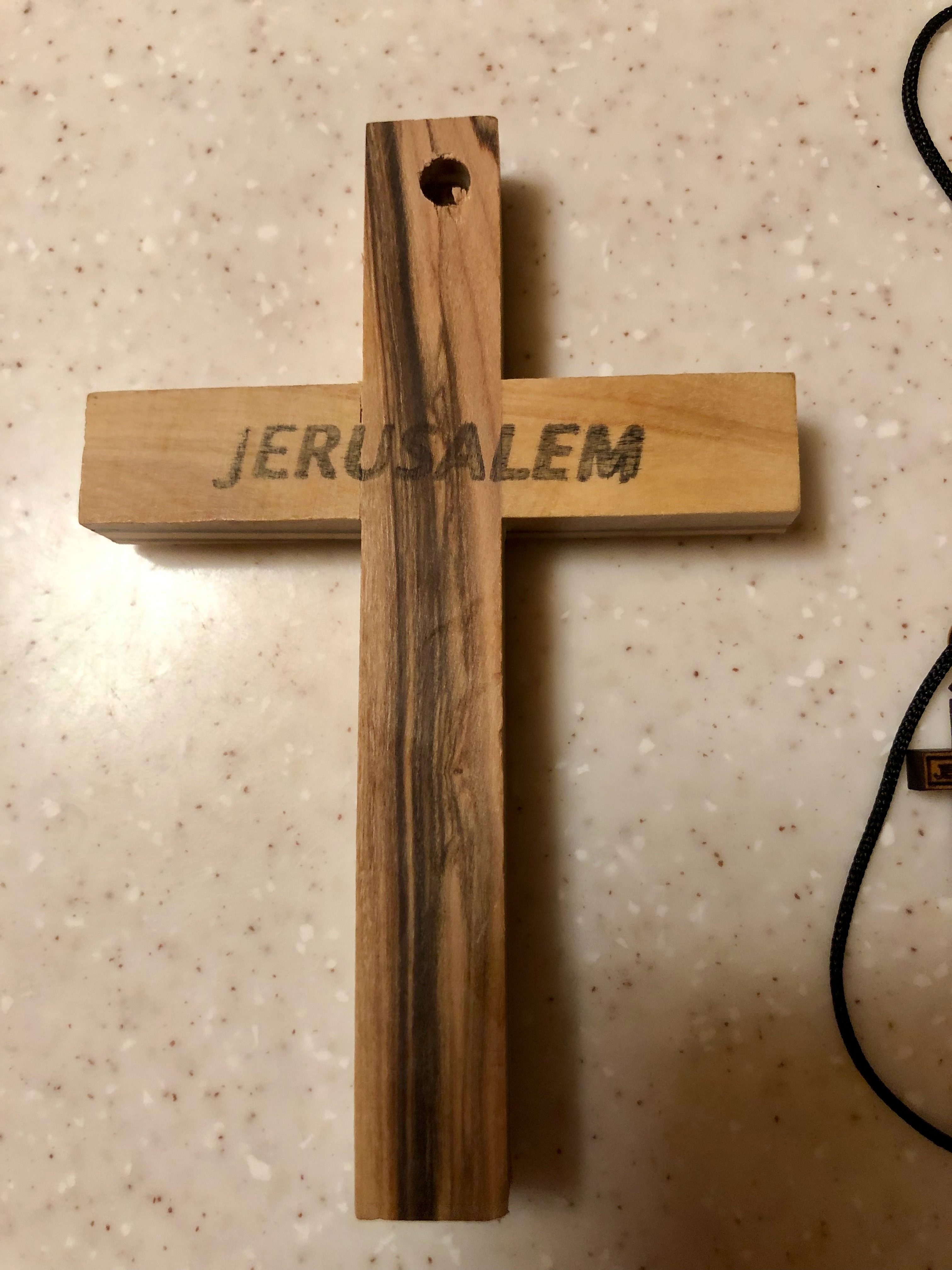 The larger cross has "Jerusalem" on the back. The small cross has "Jerusalem" on the front. No way to tell, of course, whether the crosses actually came from Jerusalem.
