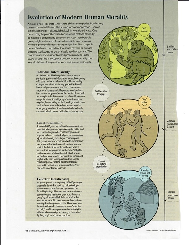 Browsing through an old issue of Scientific American that I found languishing in a drawer of magazines, a special September 2018 issue about The Science of Being Human included an article by Michael Tomasello titled "How We Learned to Put Our Fate in One Another's Hands: The Origins of Morality."
