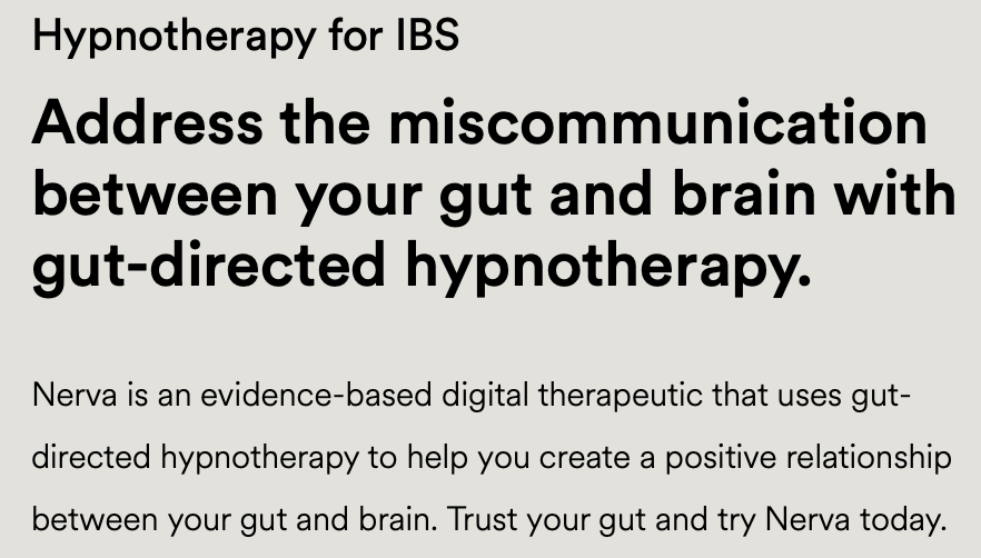 The app includes daily short readings, along with a 15-17 minute hypnotherapy session. One of the goals is to disrupt a negative brain-gut/mind-body feedback loop. This pertains to problems other than IBS, clearly.