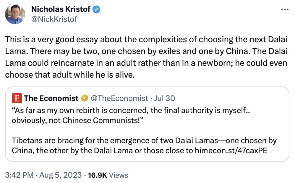Click on the continuation link to read the entire article. I wasn't aware of the intense struggle surrounding the choice of a successor to the current Dalai Lama between Chinese authorities and the Tibetan Buddhist community. The article does a good job of explaining this.