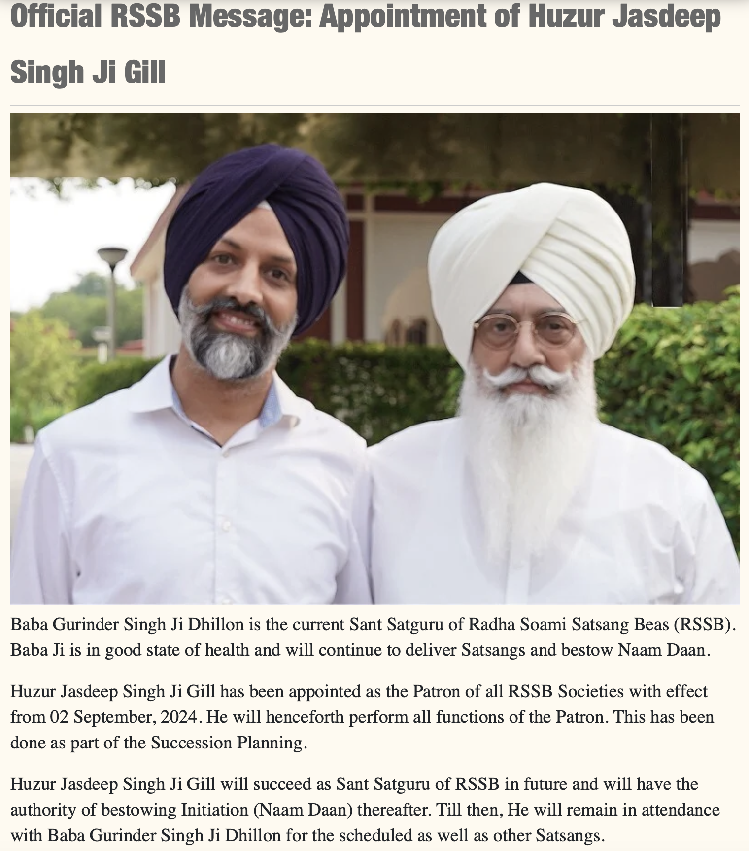 Screenshot 2024-09-02 at 10.02.06 AMThe first paragraph of this announcement says that Dhillon is both the Satguru (true guru) and Patron of RSSB. Satguru refers to the spiritual side of the guru's duties. I take it that Patron refers to the organizational/management side of the guru's duties. Gill has been nominated as Patron, effective immediately from September 2, 2024.