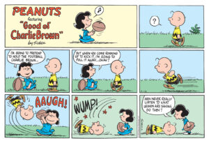 For those who grew up in the age of the Peanuts comic strip, I’m like Charlie Brown who believes that Lucy is going to hold the football so he can kick it, but that never happens, even when Lucy tells him what’s going to happen. Life is a lot like Lucy. It keeps on surprising us, yet we don’t stop believing we know what life will bring.