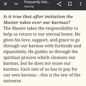 Such was the promise that lured people to become RSSB initiates. But now that promise has been declared null and void by RSSB. The guru doesn’t save anyone. He just advises on what an initiate needs to do to work out their own salvation. This is a religious bait-and-switch: lure people to become members of RSSB by making grand promises, then after they’ve been initiated, announce that what was promised is no longer guaranteed.